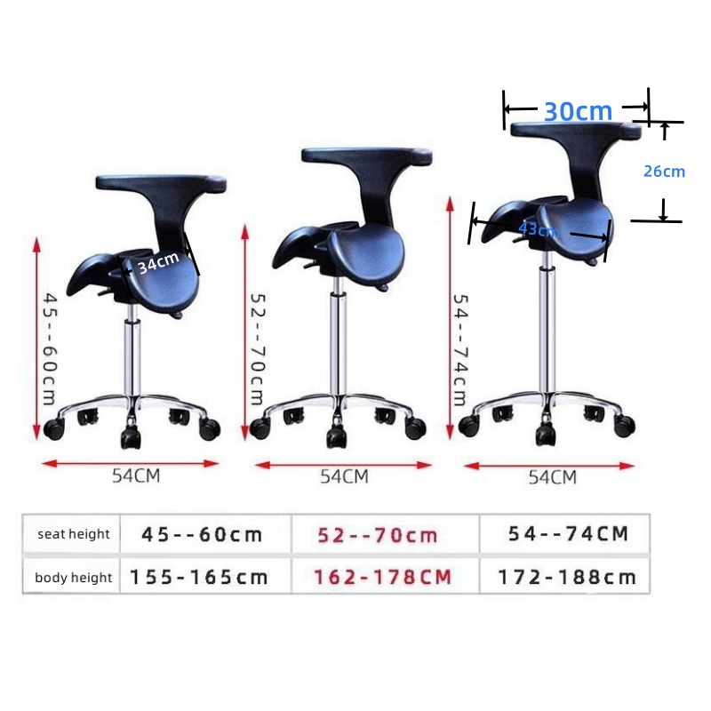 - The seat of the saddle chair is adjustable to provide you with a comfortable sitting position at any time, and the three sizes of height-adjustable air bars satisfy people of different heights in any situation.